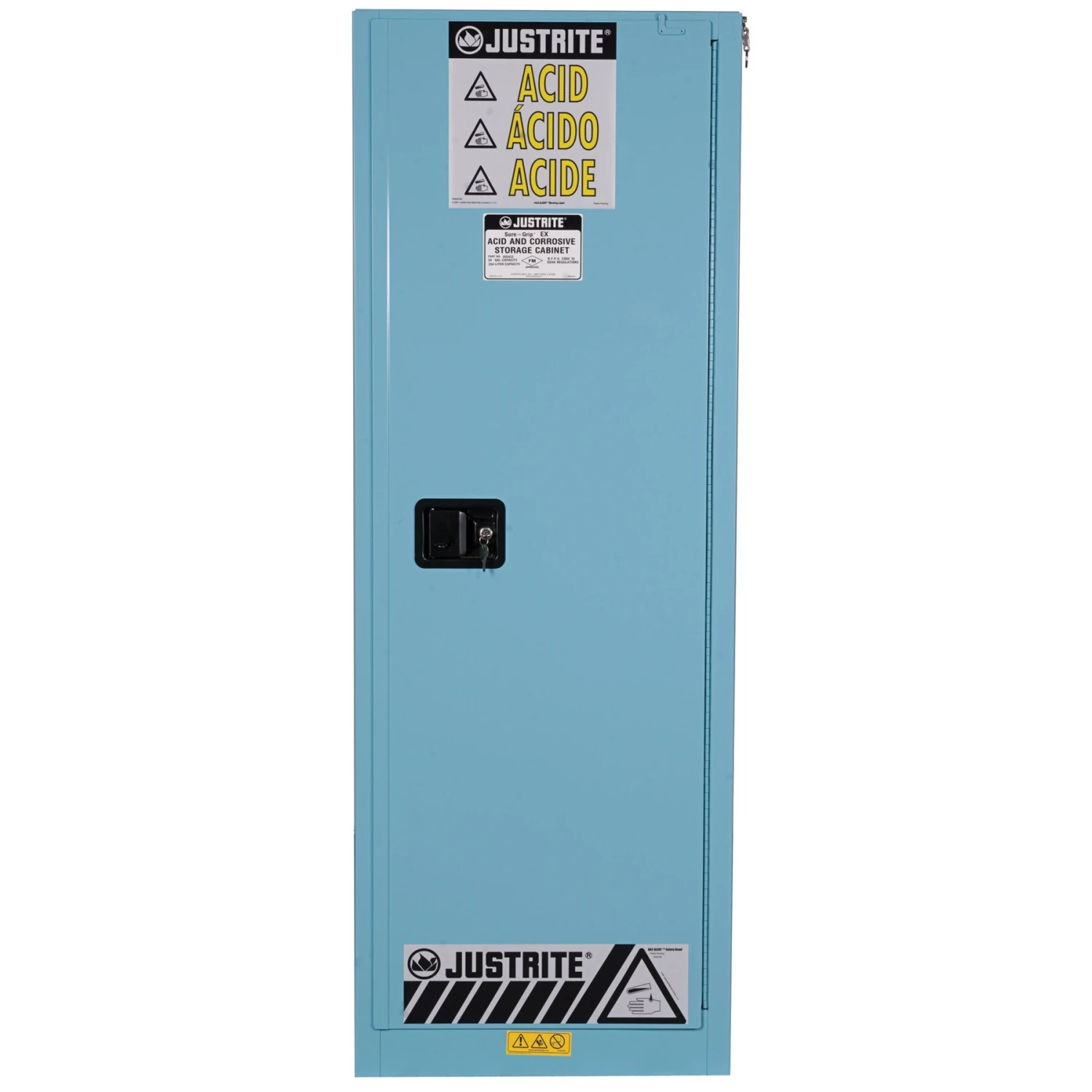 - Its blue color and warning labels bring awareness that corrosives and hazardous liquids are stored inside.