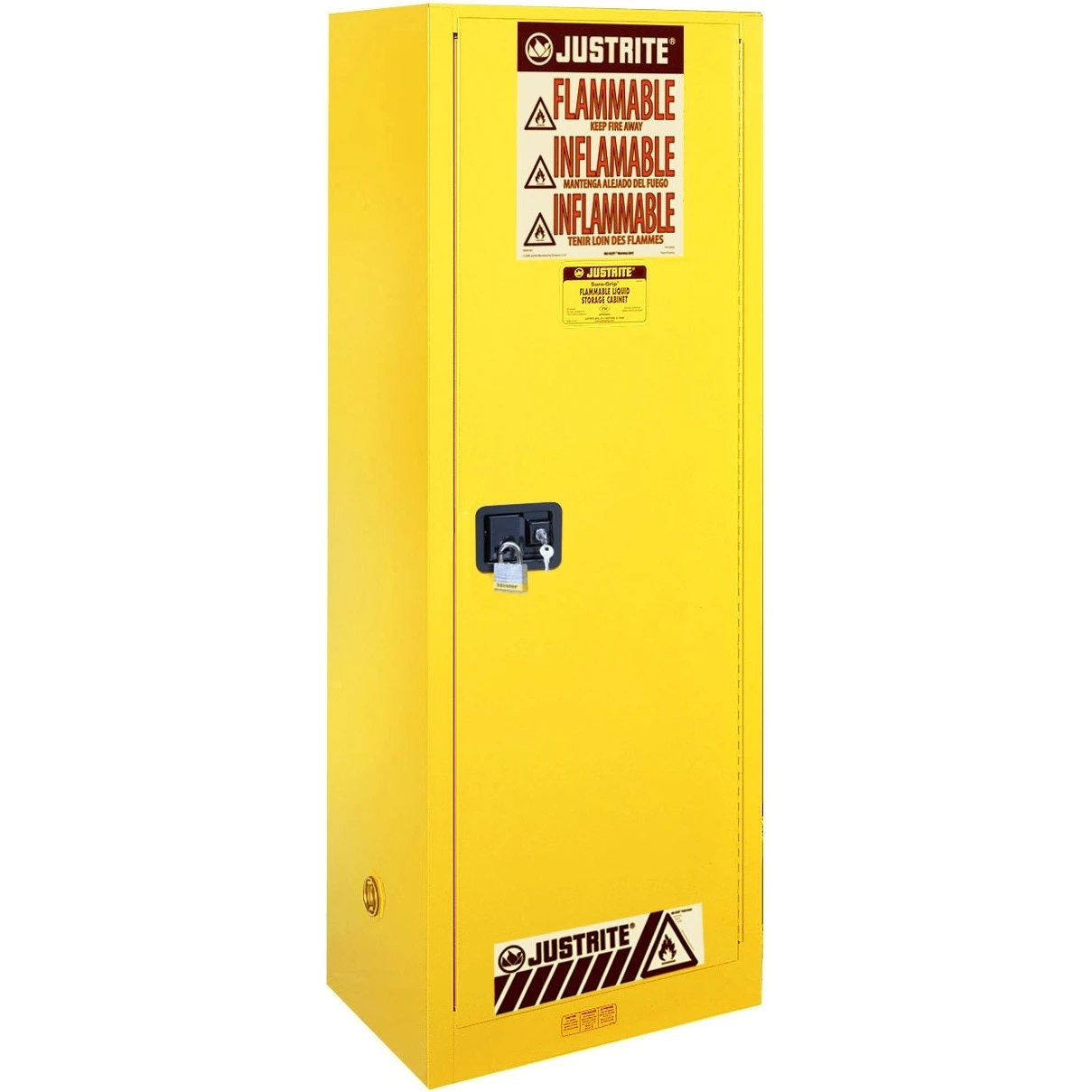 Safety cabinets are important in that their bright colors and prominent labeling brings awareness that dangerous chemicals are inside. They also keep chemicals organized and separated in a safe setting, help keep workers safe in the event of a fire, provides efficiency in that it keeps dangerous liquids near workstation, and they provide compliance with OSHA and NFPA regulations. The Sure-Grip® EX slimline flammable safety cabinet is OSHA and NFPA compliant and FM approved, it has a ten year warranty.